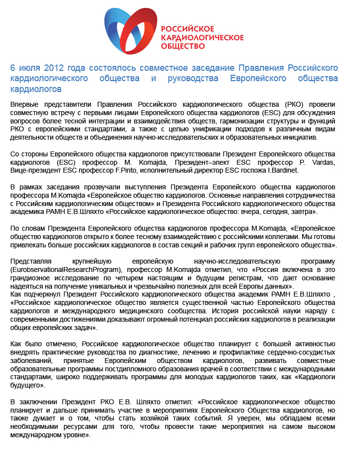 6 июля 2012 года состоялось совместное заседание Правления Российского кардиологического общества и руководства Европейского общества кардиологов